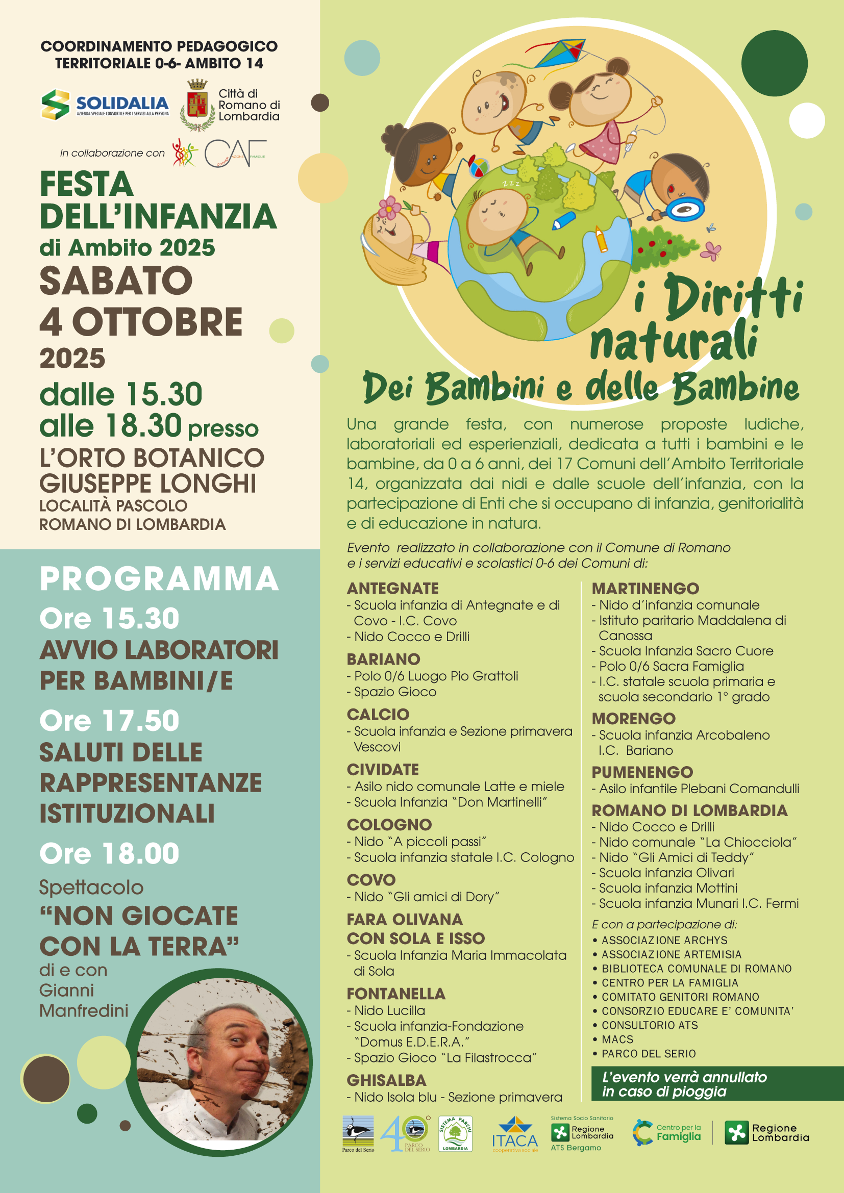 Evento realizzato in collaborazione con il Comune di Romano di Lombardia, con i servizi educativi e scolastici 0-6 dei Comuni di Antegnate, Bariano, Calcio, Cividate, Cologno al Serio, Covo, Fara Olivana con Sola, Isso, Fontanella, Ghisalba, Martinengo, Morengo, Pumenengo e Romano di Lombardia; e con la partecipazione di Enti che si occupano di infanzia, genitorialità ed educazione in natura.
